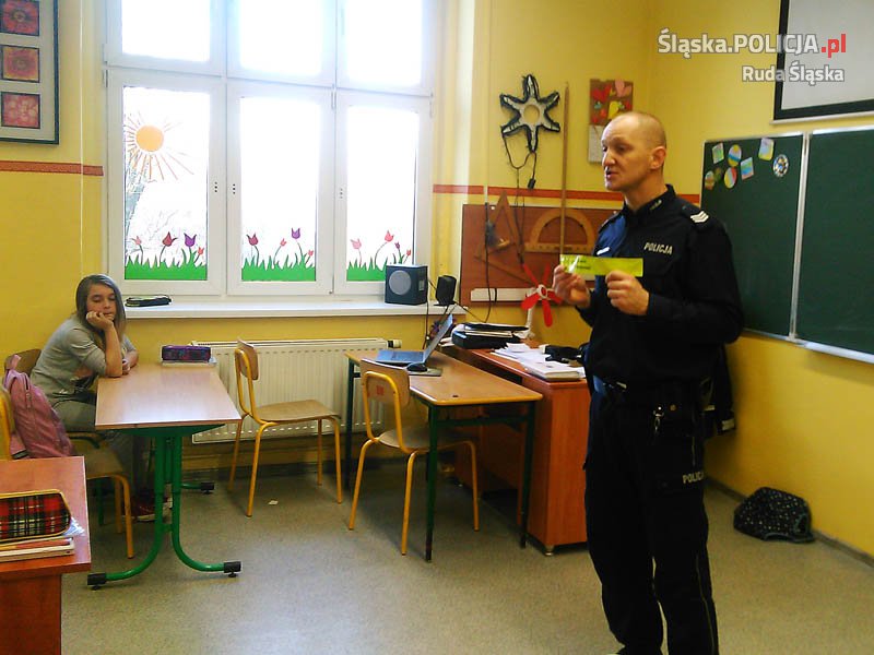 Wizyta w szkole, to okazja dla mundurowych do przypomnienia młodym mieszkańcom Rudy Śląskiej, o zasadach bezpieczeństwa podczas drogi do i ze szkoły ale i popołudniowego wypoczynku. Policjanci z rudzkiej komendy prowadzą cykl spotkań z dziećmi szkół podstawowych. Dzisiaj profilaktyk z komendy gościł w klasach szóstych Szkoły Podstawowej Nr 7 przy ulicy 1-go Maja. Podczas spotkania przypomniał on o zasadach prawidłowego i bezpiecznego zachowania się czasie drogi do i ze szkoły, ale i w trakcie popołudniowych spacerów. Oczywiście była również mowa o prawidłowym zachowaniu. Sierżant sztabowy Roman Aleksandrowicz zachęcał także do noszenia na ubraniach elementów odblaskowych, dzięki którym dzieci będą lepiej widoczne dla kierowców. Spotkanie dotyczyło również szeroko pojętych zachowań młodych ludzi, które są niezgodne z obowiązującymi przepisami prawa. Profilaktyk, tłumaczył uczniom, co to jest demoralizacja oraz czyn karalny i co grozi młodemu człowiekowi, który nie potrafi dostosować swojego zachowania do obowiązujących norm i zasad. Poruszył także temat przemocy wśród uczniów starszych klas. Część spotkania nawiązywała do problemu bezpiecznego korzystania z internetu i zagrożeń związanych z niewłaściwym korzystaniem z sieci.