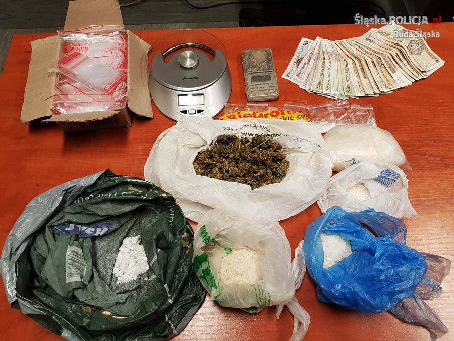 Policjanci referatu kryminalnego z komisariatu 2 zatrzymali 40-letniego dilera narkotykowego. W trakcie przeszukania jego mieszkania i przynależących pomieszczeń, policjanci znaleźli znaczne ilości amfetaminy i marihuany. Mężczyzna w swoim mieszkaniu posiadał kilkanaście woreczków z narkotykami, a w użytkowanej przez siebie piwnicy, prawdziwy skład. Detektywi zabezpieczyli amfetaminę i jej pochodną, w ilości pozwalającej na wydzielenie ponad 4500 działek narkotyku, oraz marihuanę którą można podzielić na ponad 50 działek dilerskich. Śledczy znaleźli także wagi i woreczki do dalszego porcjowania narkotyków. Stróże prawa przejęli również znaczną kwotę pieniędzy, które mogą pochodzić ze sprzedaży narkotyków. Zatrzymany mieszkaniec Rudy Śląskiej został umieszczony w policyjnym areszcie, a śledczy jeszcze dziś przedstawią mu pierwsze zarzuty. Prowadzący sprawę policjanci traktują ją jako rozwojową i nie wykluczają, kolejnych zarzutów.