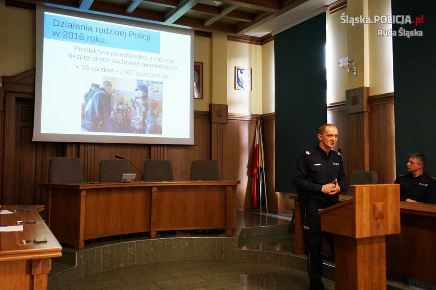 Ostatnim tematem inauguracyjnej debaty, była profilaktyka i działania podejmowane w tym zakresie przez rudzkich policjantów. Działania w tym zakresie to głównie spotkania mundurowych z mieszkańcami naszego miasta i to w różnym wieku. Policjanci edukację o bezpieczeństwie zaczynają od najmłodszych rudzian, odwiedzając ich w przedszkolach, a kończą na najstarszych w domach seniorów. Jak powiedział profilaktyk z komendy sierż.szt. Roman Aleksandrowicz – w trakcie jednego ze spotkań moją słuchaczką i to aktywnie włączającą się w dyskusję o bezpieczeństwie osób starszych, była pani która skończyła 101 lat.