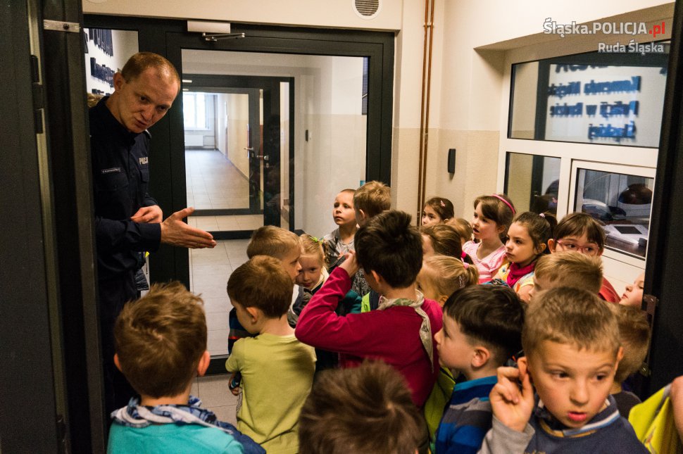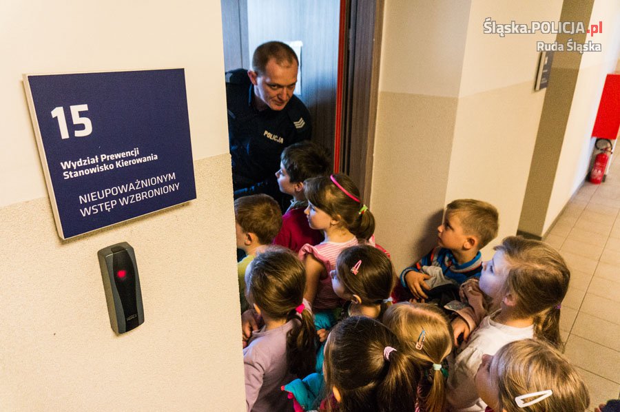 Komendę Miejską Policji w Rudzie Śląskiej odwiedziły dzieci z Przedszkola Miejskiego nr 4. Przedszkolaki miały okazję spotkać się z policjantem wydziału prewencji, który rozmawiał z nimi o bezpieczeństwie na drodze, w domu i na podwórku. Dzieci zobaczyły też policyjne stanowisko kierowania, mogły też z bliska obejrzeć wyposażenie technika kryminalistyki oraz radiowóz pogotowia wypadkowego. Mundurowy pokazał dzieciom także nową aplikację „Moja Komenda” która ułatwia dotarcie do policjantów.