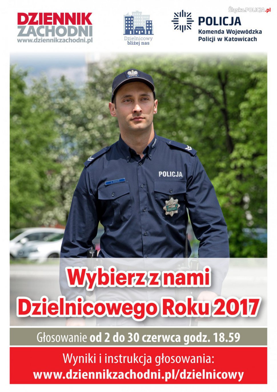 Plebiscyt "Najpopularniejszy dzielnicowy województwa śląskiego 2017" zorganizowany został dzięki współpracy Komendy Wojewódzkiej Policji w Katowicach z firmą Polska Press sp. z o.o. - wydawcą "Dziennika Zachodniego". To właśnie czytelnicy gazety wyłonią najlepszego dzielnicowego naszego garnizonu. Głosowanie trwa do 30 czerwca 2017 roku. Głosować można za pomocą SMS-ów (koszt 2,46 zł z VAT), portalu społecznościowego Facebook i „kliknięć” na stronie www.dziennikzachodni.pl
