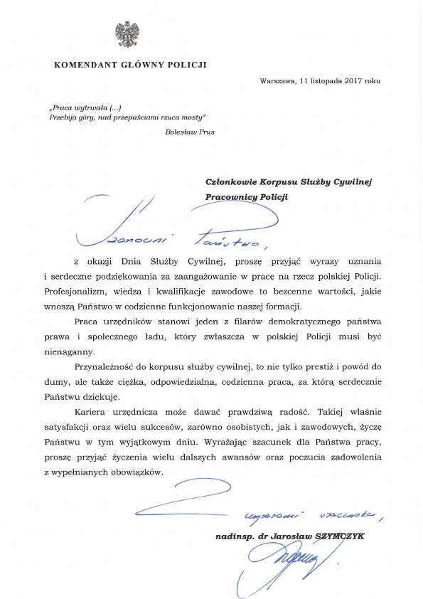 Z okazji Dnia Służby Cywilnej, w imieniu swoim, a także kadry kierowniczej, składam serdeczne podziękowania i wyrazy uznania dla wszystkich pracowników rudzkiego garnizonu policji. Dziękuję za trud włożony w codzienną pracę, a także zaangażowanie, wiedzę i profesjonalizm. Doceniając Państwa sumienność w realizowaniu codziennych zadań, życzę satysfakcji oraz wielu sukcesów.
