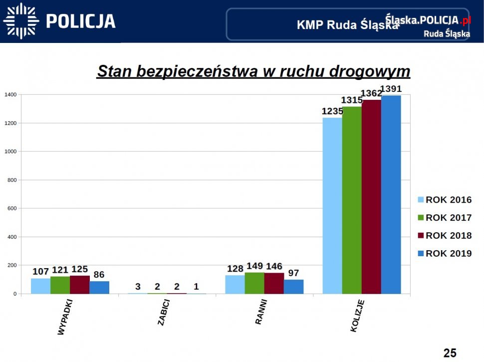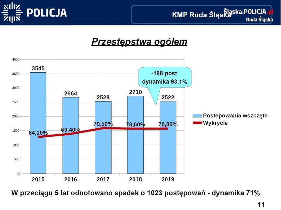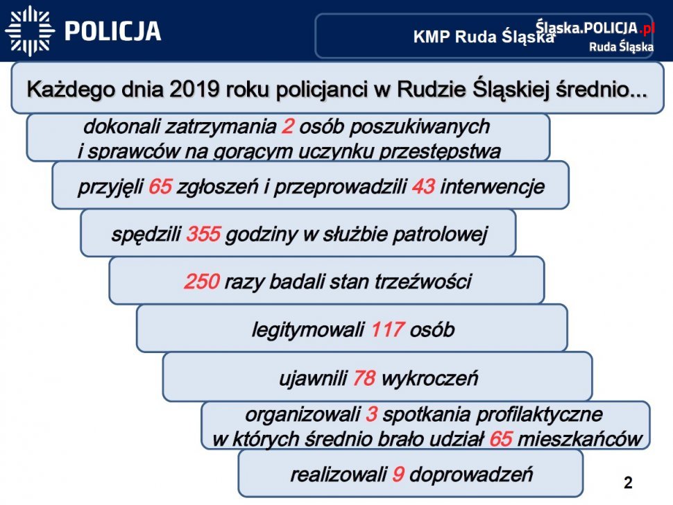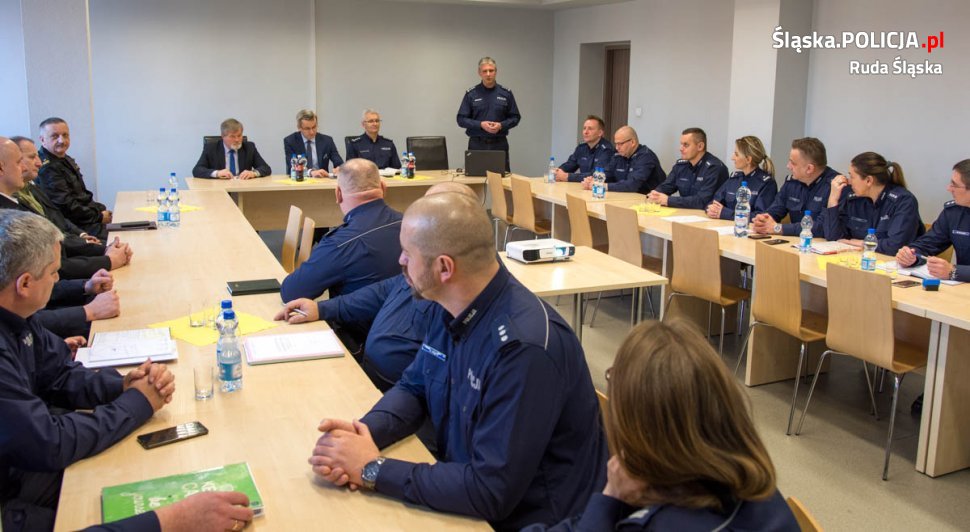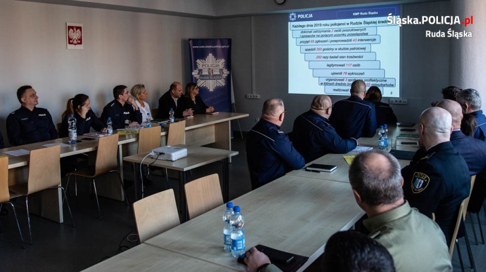 Gośćmi narady służbowej byli Wiceprezydent Krzysztof Mejer, Wiceprzewodniczący Rady Miejskiej Kazimierz Myszur oraz szefowie służb z którymi rudzka policja współpracuje na co dzień. Wyniki pracy rudzkich stróżów prawa omówili komendant miejski insp. Grzegorz Strzęciwilk oraz jego zastępca – nadkom. Dawid Gil. Ubiegły rok to przede wszystkim utrzymanie trendu i dalszy spadek przestępczości, w szczególności tej najbardziej uciążliwych z punktu widzenia obywatela, a także więcej patroli drogówki na ulicach miasta. Rok 2019 to już kolejny rok, w którym znacznie zmniejszyła się liczba przestępstw kryminalnych ogółem. Fakt ten zawdzięczać można m. in. coraz lepszej prewencji i ciężkiej pracy policjantów pionu kryminalnego. Rudzcy mundurowi mogą też pochwalić się wzrostem wykrywalności przestępstw kryminalnych – osiągnięto tu poziom 78,80 %. W kategorii „kradzież z włamaniem” wykrywalność to 67,6 % co stanowi wzrost o 16 % w stosunku do roku 2018. Praktycznie w każdej z kategorii przestępstw odnotowaliśmy większą wykrywalność sprawców w porównaniu do lat poprzednich. Stan bezpieczeństwa na rudzkich drogach również uległ poprawie, w ubiegłym roku odnotowaliśmy mniej wypadków z udziałem rannych, nastąpił jednak nieznaczny wzrost ilości kolizji drogowych. Policjanci zatrzymali więcej pijanych kierowców. W ciągu ubiegłego roku policjanci przeprowadzili prawie 100 tysięcy badań na zawartość alkoholu w wydychanym powietrzu. Wzrosła liczba policjantów drogówki na ulicach naszego miasta, a co za tym idzie ich efektywność. Cykliczne akcje związane z dbaniem o bezpieczeństwo pieszych przyniosły efekty w postaci zmniejszenia ilości zdarzeń z udziałem niechronionych uczestników ruchu drogowego. Ilość wypadków z ich udziałem spadła do 31, czyli o 11 mniej niż w roku 2018.