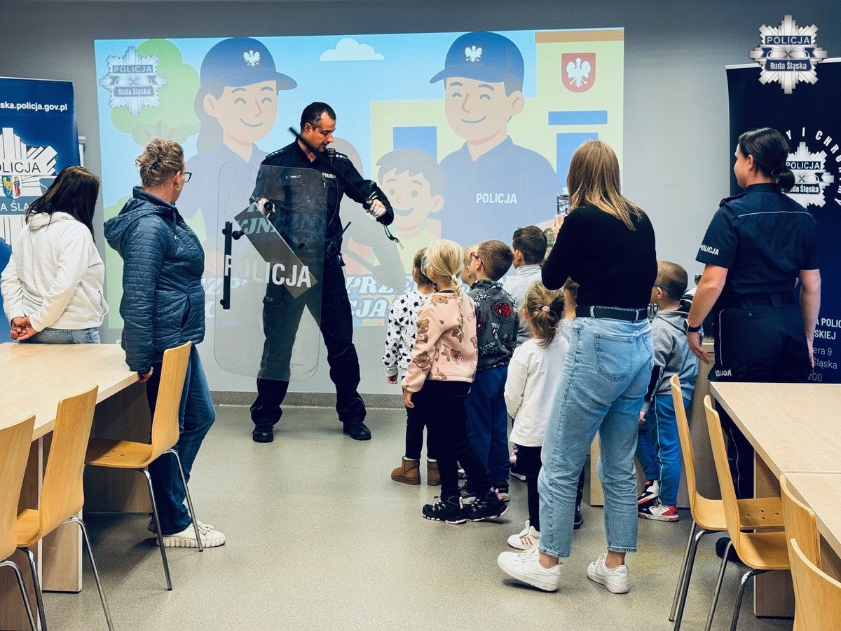 Do Komendy Miejskiej Policji w Rudzie Śląskiej zawitały dzieci z grupy „Pszczółek” z Miejskiego Przedszkola nr 4. Wizyta odbyła się w ramach akcji profilaktycznej „Bezpieczny przedszkolak. Policyjna lekcja z uśmiechem”, której głównym celem jest budowanie pozytywnego wizerunku Policji wśród najmłodszych, kształtowanie poczucia bezpieczeństwa, zapoznanie dzieci z podstawowymi zasadami ruchu drogowego oraz przybliżenie zawodu policjanta w przyjaznej atmosferze.