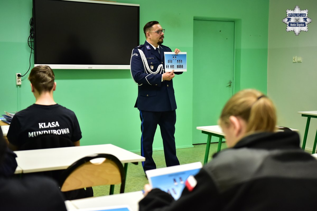 Podkomisarz Szymon Wolf z rudzkiej komendy jako jeden z policjantów prowadzi zajęcia z uczniami oddziału o profilu mundurowym w IV Liceum Ogólnokształcącym w rudzkim Orzegowie. Zgodnie z harmonogramem zaplanowanym na rok szkolny 2025/2026, w ramach zawartego porozumienia, policjanci przedstawiają młodzieży specyfikę służby w naszej formacji oraz omawiają zadania Policji w zakresie bezpieczeństwa i porządku publicznego.