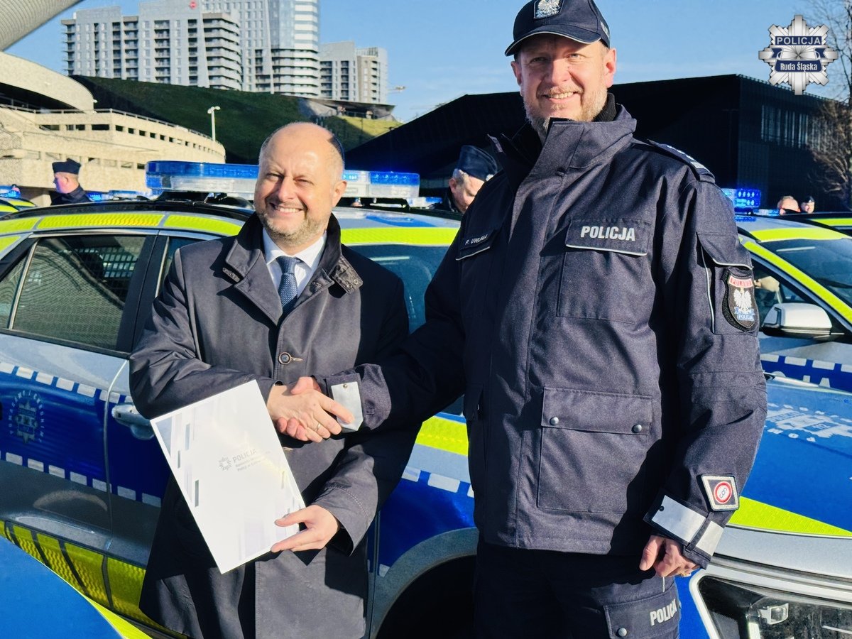Uroczyste przekazanie radiowozu dla rudzkiej jednostki oraz innych komend garnizonu śląskiego odbyło się w Katowicach. Wydarzeniu przewodniczył Komendant Wojewódzki Policji w Katowicach nadinspektor Mariusz Krzystyniak wraz ze swoim Zastępcą od spraw logistycznych młodszym inspektorem Markiem Gadzińskim, a wśród gości nie zabrakło Komendanta Miejskiego Policji w Rudzie Śląskiej inspektora dr Piotra Uwijały i Prezydenta Miasta Ruda Śląska Michała Pierończyka.