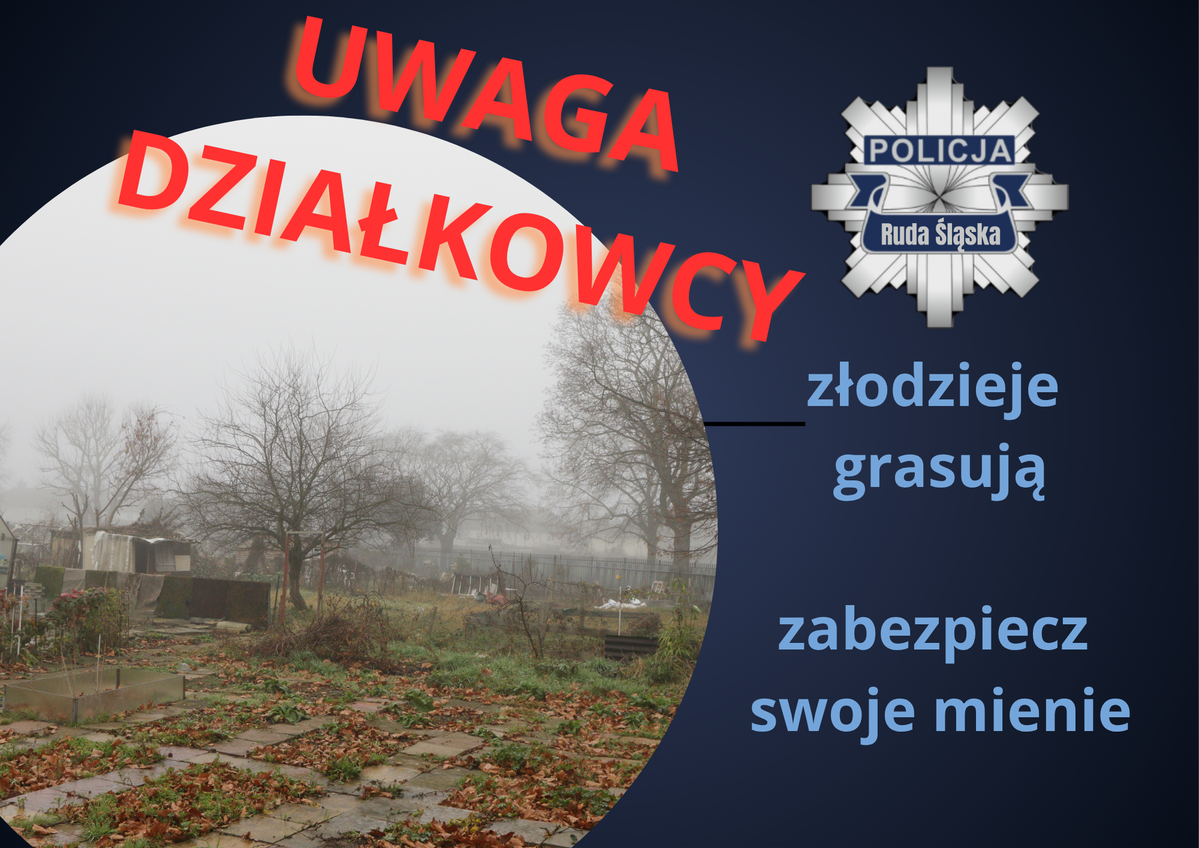 Nadchodzący przełom jesieni i zimy sprawia, że coraz rzadziej działkowicze będą odwiedzać swoje ogródki. Padający deszcz i szybki zmrok sprzyja jednak złodziejom, którzy coraz częściej odwiedzają Wasze działki. Rudzcy policjanci stale kontrolują tereny przyległe do ogródków działkowych, ale przeważnie nie są w stanie wejść na ich tereny. Pamiętajmy! Każde dodatkowe zabezpieczenie ogrodowej altany jest dodatkowym utrudnieniem dla złodzieja.