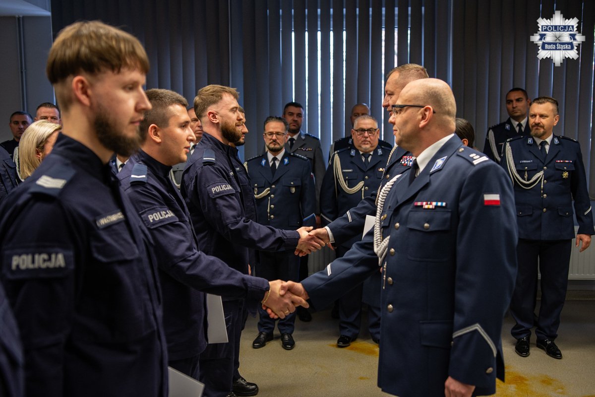 W ubiegły czwartek w Komendzie Miejskiej Policji w Rudzie Śląskiej odbyła się miła uroczystość. Szef rudzkiego garnizonu insp. dr Piotr Uwijała wraz ze swoim zastępcą mł. insp. Grzegorzem Wróblem dokonali uroczystego wprowadzenia dwóch nowych oficerów oraz docenili swoich podwładnych za wzorowe wykonywanie obowiązków służbowych i osiągnięcie bardzo dobrych wyników w służbie. Takie zdecydowane działania mundurowych zaowocowały ujęciem sprawców wielu przestępstw i poważnych wykroczeń. Wyróżnieni stróże prawa odebrali rozkazy o wyróżnieniu nagrodą pieniężną i gratulacje.