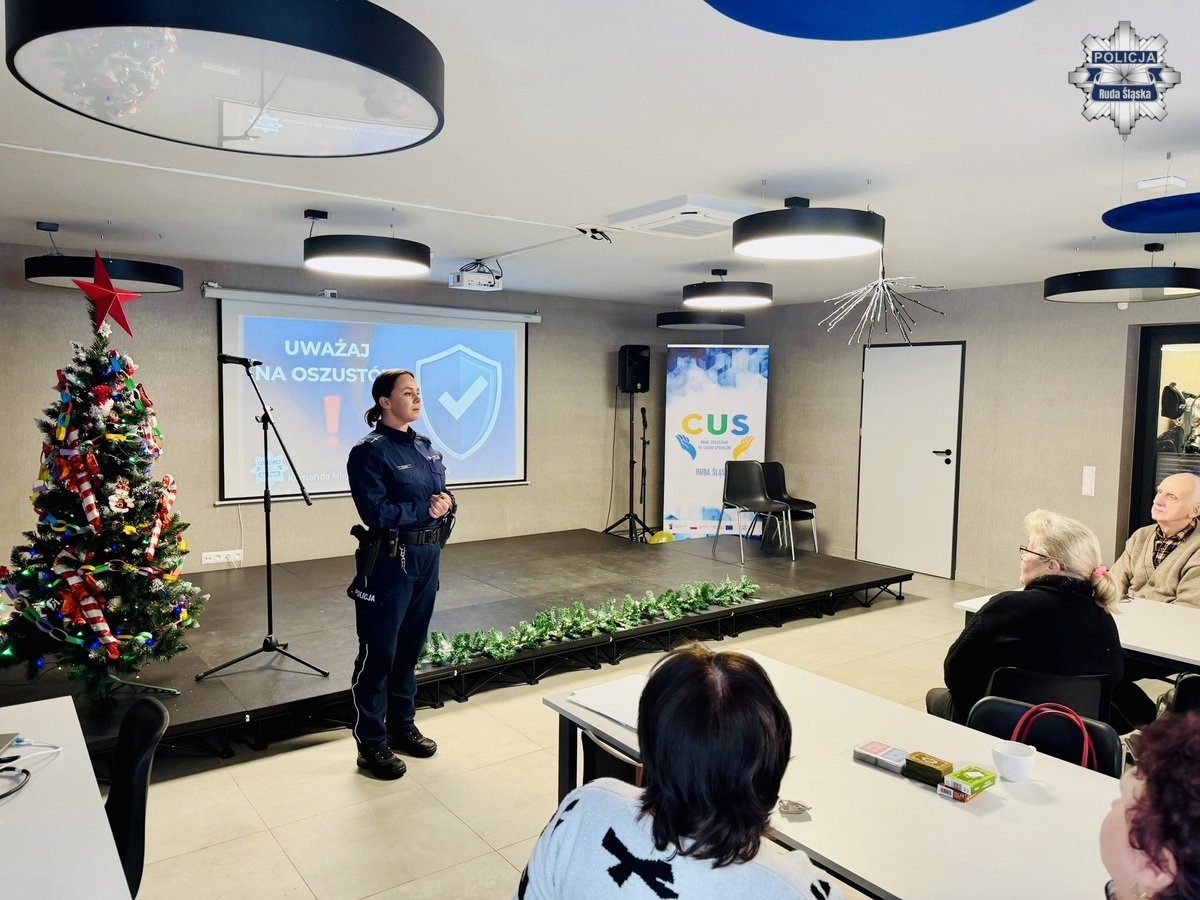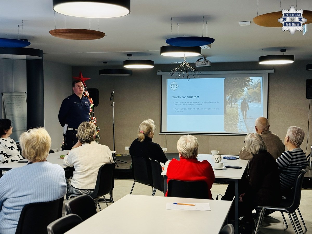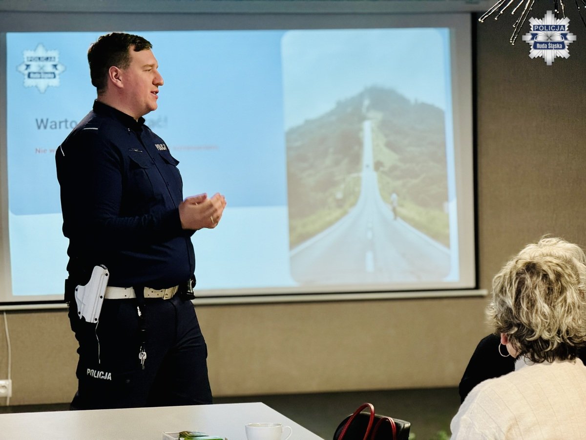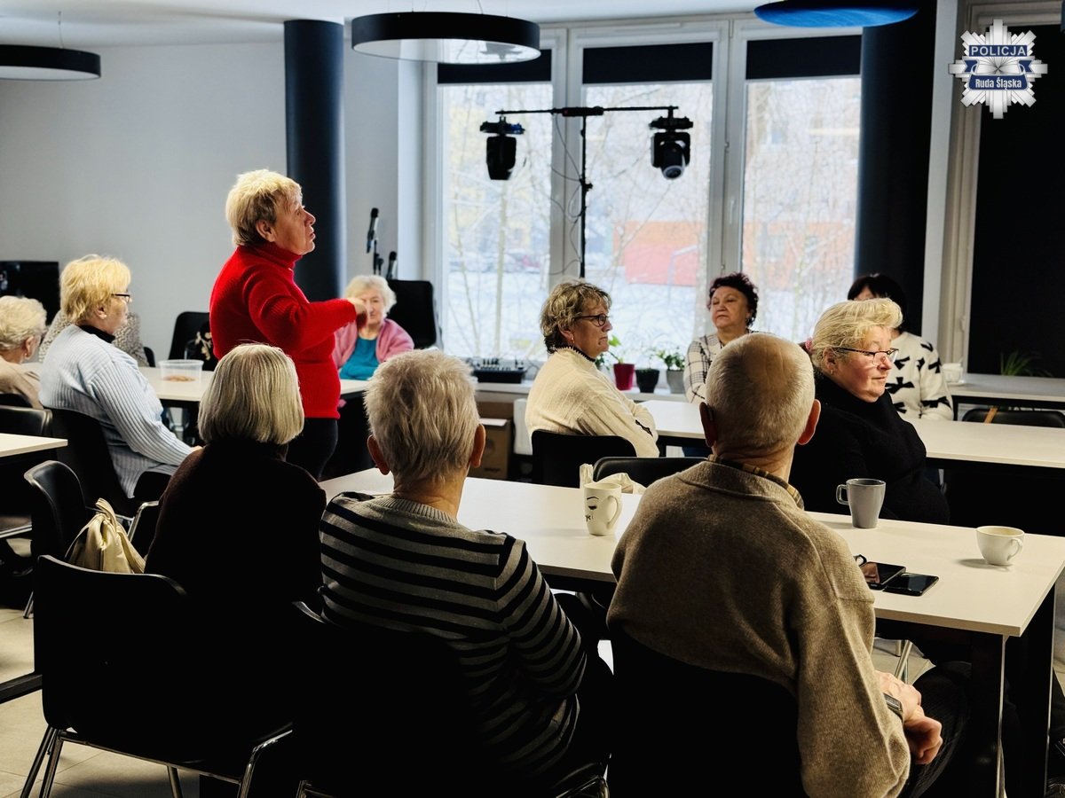 W pomieszczeniach usługowych Orbita, należących do Centrum Usług Społecznych, odbyło się spotkanie policjantów z Komendy Miejskiej Policji w Rudzie Śląskiej z grupą seniorów, poświęcone szeroko rozumianemu bezpieczeństwu. Uczestnicy mieli okazję poznać mechanizmy najczęściej stosowanych oszustw oraz dowiedzieć się, jak nie dać się zmanipulować przestępcom działającym pod różnymi legendami. Nie zabrakło również praktycznych porad dotyczących bezpieczeństwa w ruchu drogowym, szczególnie z perspektywy pieszych oraz osób z niepełnosprawnościami.