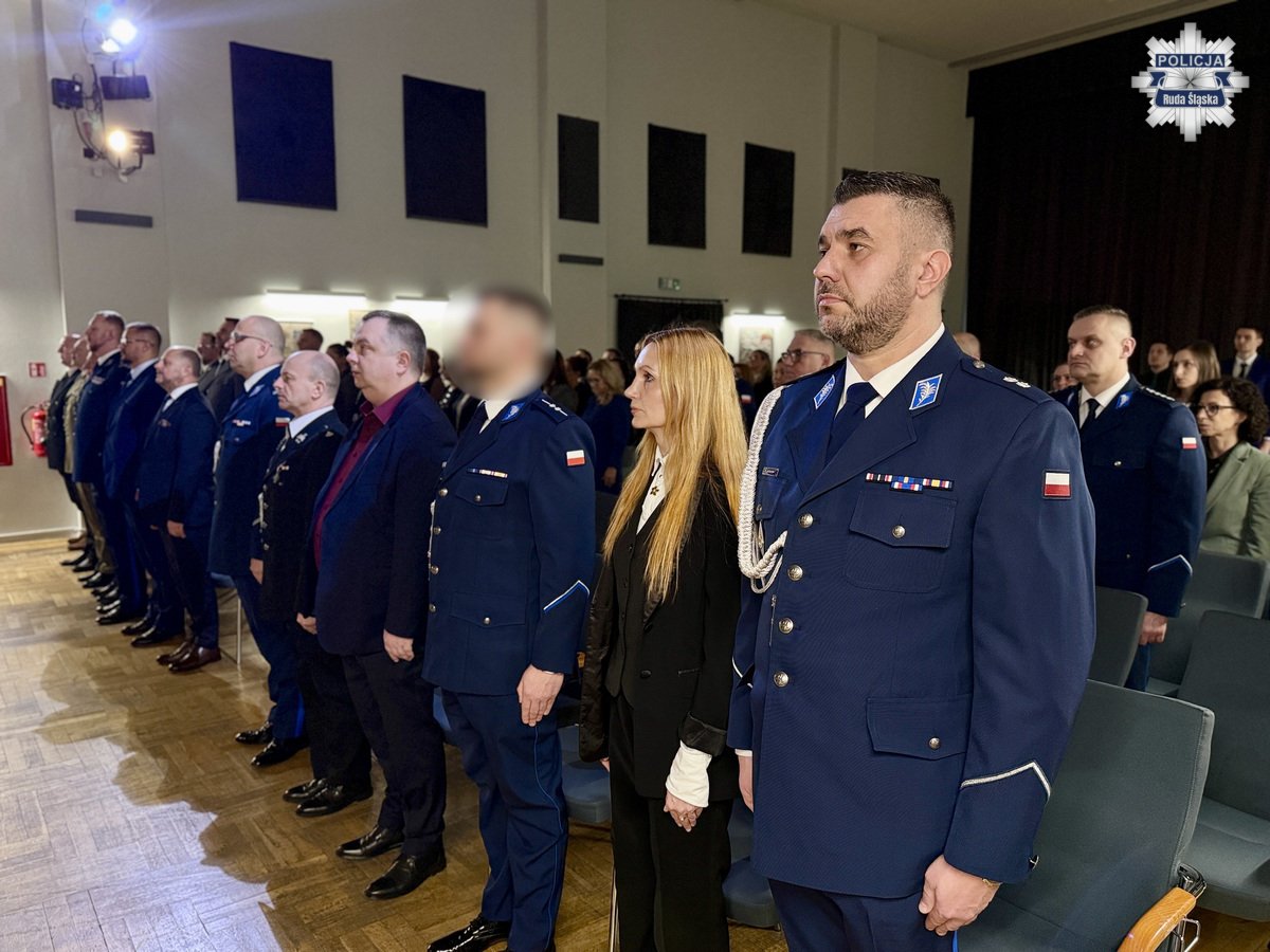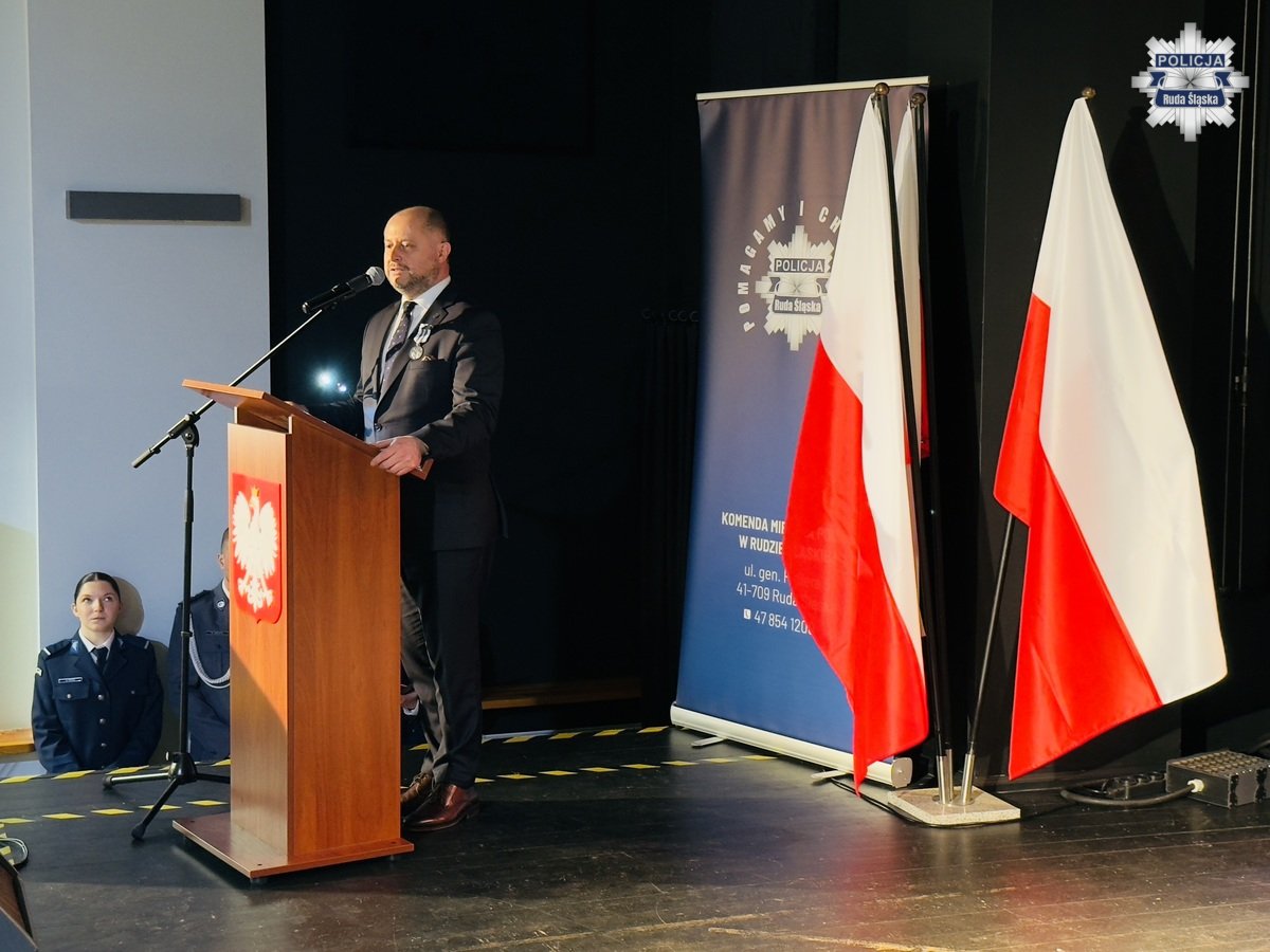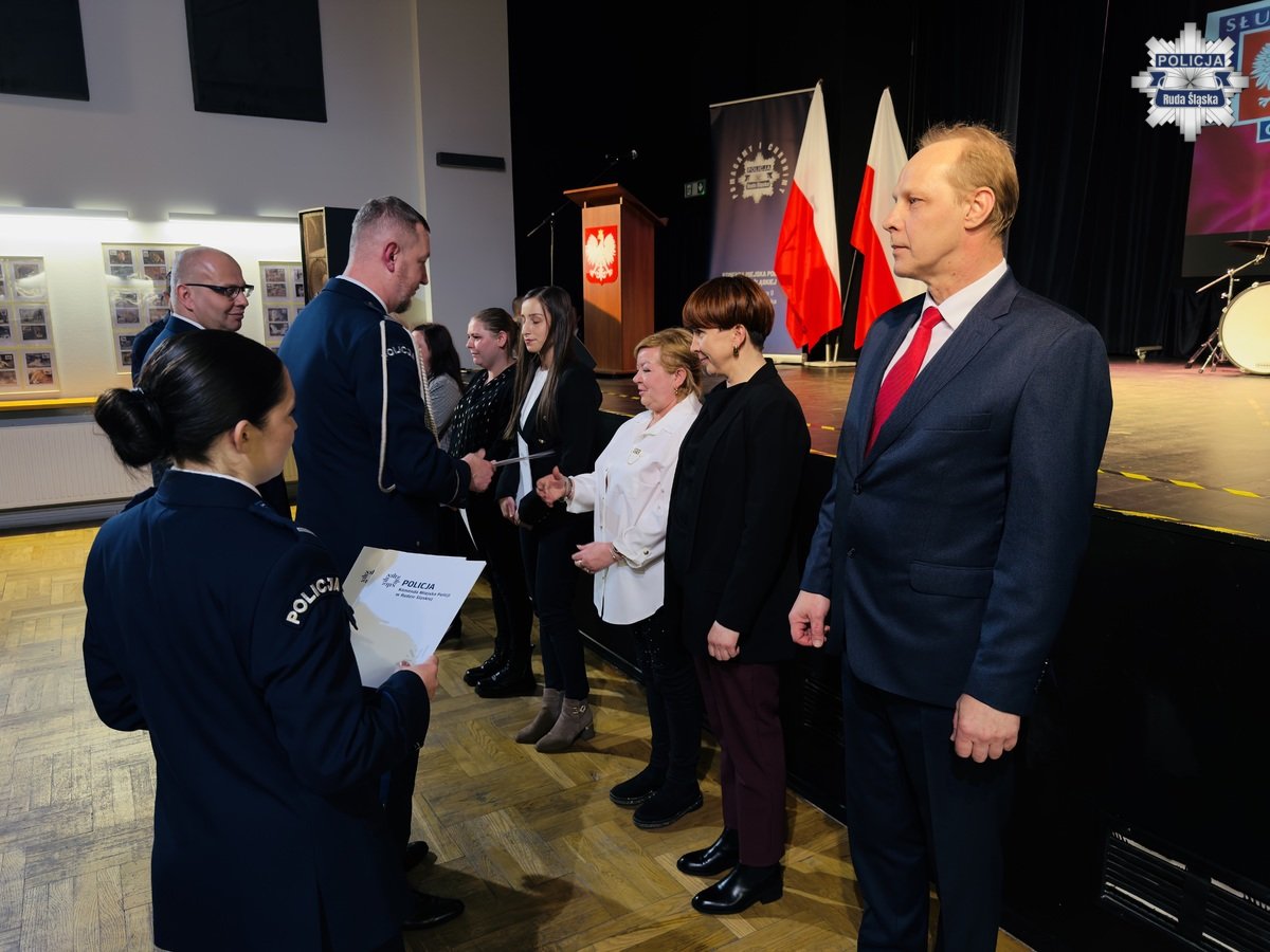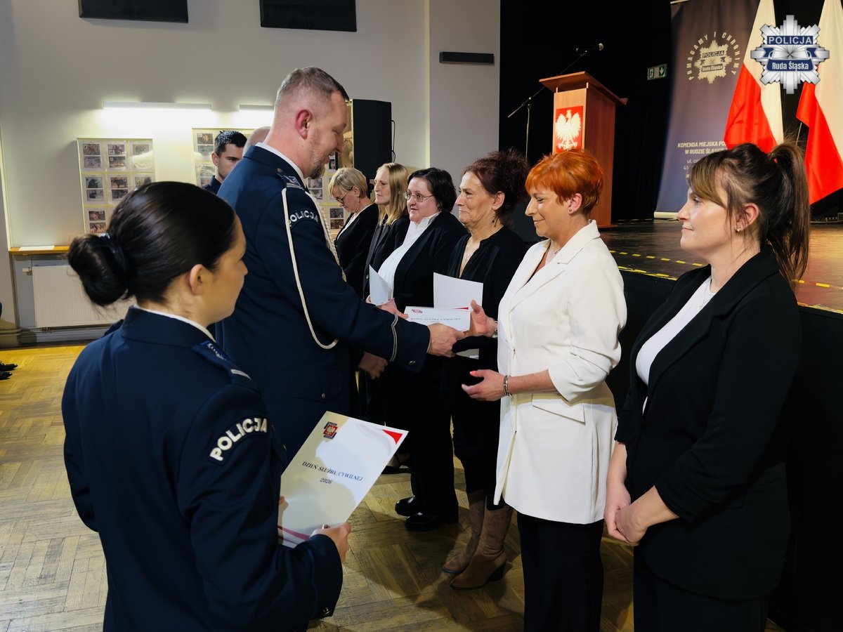 Wczoraj, 12 lutego 2026 r. w Młodzieżowym Domu Kultury w Rudzie Śląskiej odbyła się uroczysta zbiórka z okazji obchodów Dnia Służby Cywilnej w rudzkim garnizonie Policji. Podziękowania pracownikom cywilnym Komendy Miejskiej Policji w Rudzie Śląskiej złożył Komendant Miejski Policji w Rudzie Śląskiej insp. dr Piotr Uwijała wraz z Pierwszym Zastępcą Komendanta Miejskiego Policji w Rudzie Śląskiej mł. insp. Grzegorzem Wróblem. W trakcie uroczystości miało także miejsce uroczyste wprowadzenie nowego oficera polskiej Policji podkom. Kamila Jaskulskiego. Ponadto, w dowód uznania za szczególne zaangażowanie we wsparcie ustawowych działań Policji i działalność patriotyczną, medalem „100-lecia Śląskiej Policji” uhonorowano Pana Michała Pierończyka - Prezydenta Miasta Ruda Śląska oraz pracowników cywilnych naszej komendy.