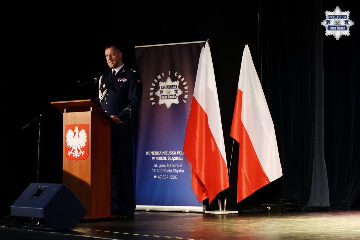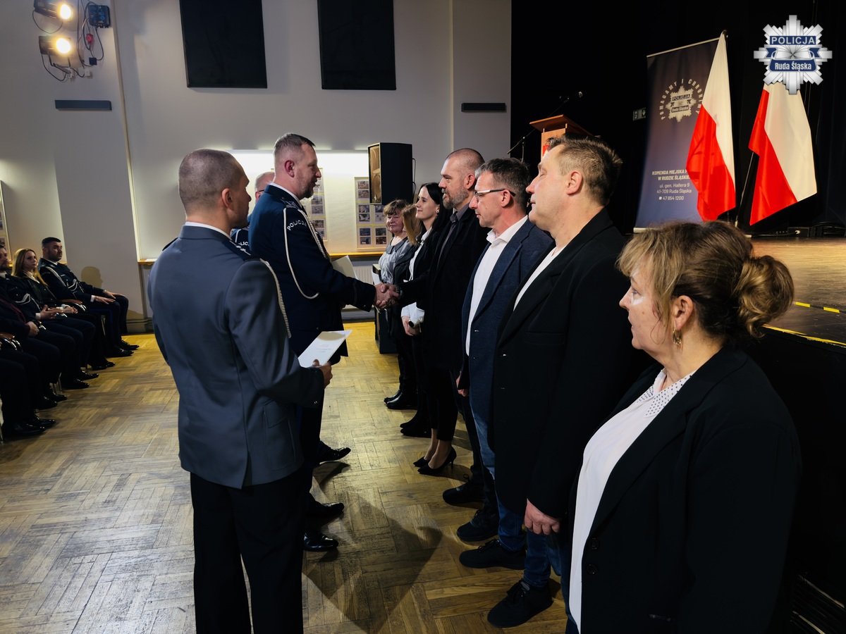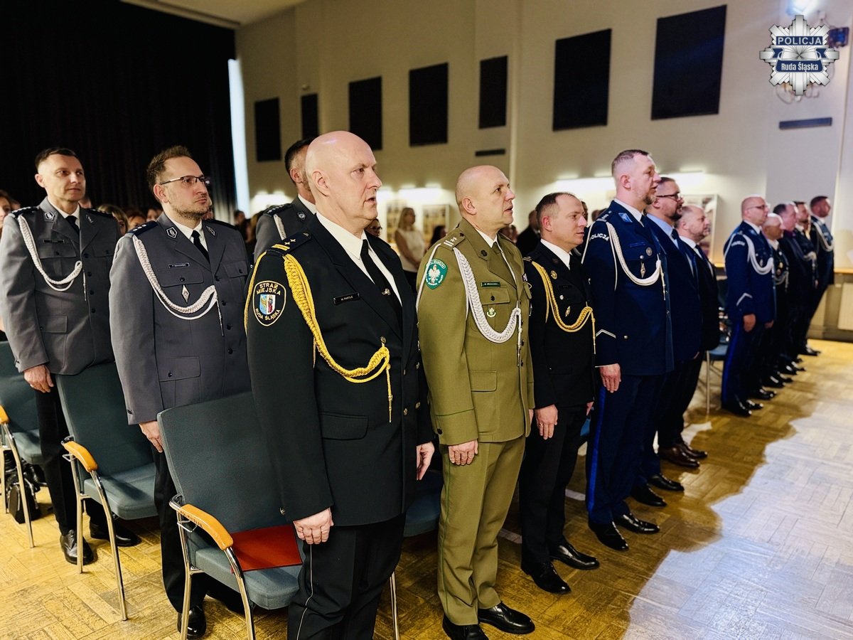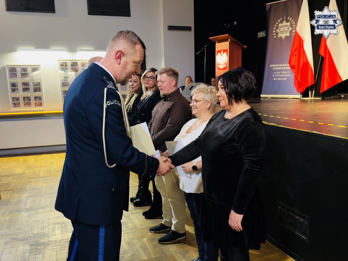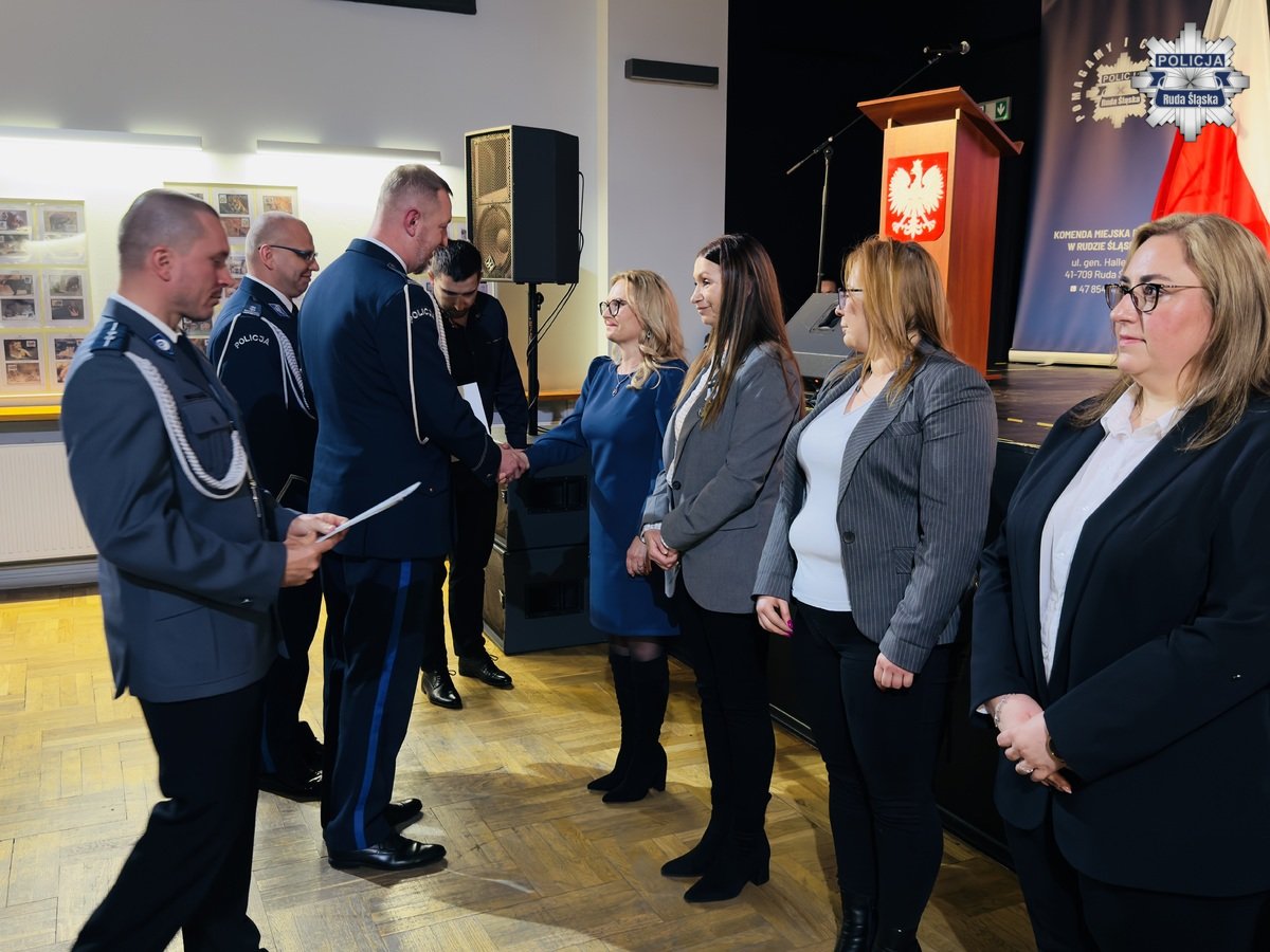 Wczoraj, 12 lutego 2026 r. w Młodzieżowym Domu Kultury w Rudzie Śląskiej odbyła się uroczysta zbiórka z okazji obchodów Dnia Służby Cywilnej w rudzkim garnizonie Policji. Podziękowania pracownikom cywilnym Komendy Miejskiej Policji w Rudzie Śląskiej złożył Komendant Miejski Policji w Rudzie Śląskiej insp. dr Piotr Uwijała wraz z Pierwszym Zastępcą Komendanta Miejskiego Policji w Rudzie Śląskiej mł. insp. Grzegorzem Wróblem. W trakcie uroczystości miało także miejsce uroczyste wprowadzenie nowego oficera polskiej Policji podkom. Kamila Jaskulskiego. Ponadto, w dowód uznania za szczególne zaangażowanie we wsparcie ustawowych działań Policji i działalność patriotyczną, medalem „100-lecia Śląskiej Policji” uhonorowano Pana Michała Pierończyka - Prezydenta Miasta Ruda Śląska oraz pracowników cywilnych naszej komendy.