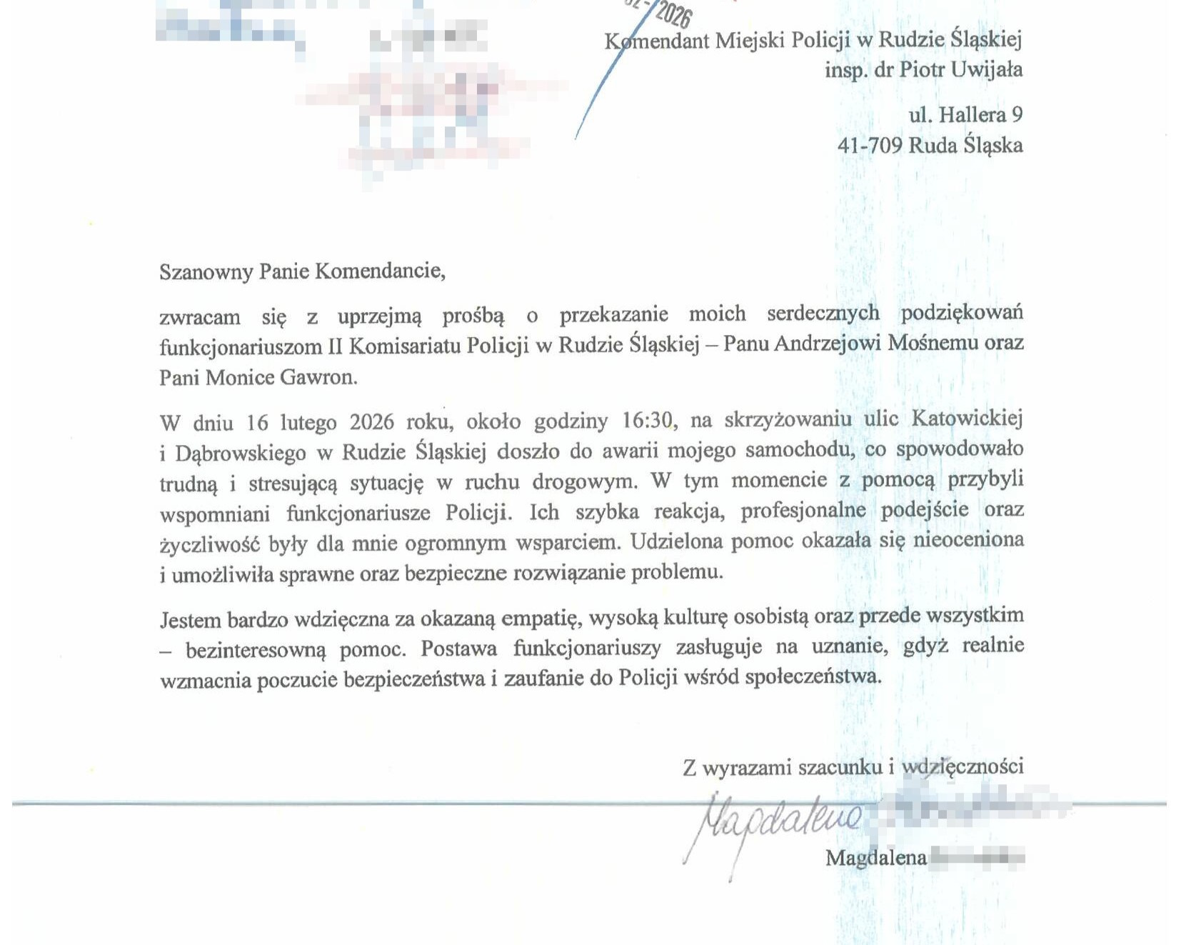 Do Komendanta Miejskiego Policji w Rudzie Śląskiej wpłynęły podziękowania skierowane do policjantów II Komisariatu Policji w Rudzie Śląskiej. Autorka wiadomości wyraziła wdzięczność za pomoc udzieloną w trudnej sytuacji drogowej oraz podkreśliła profesjonalizm i zaangażowanie mundurowych. Takie słowa uznania są dla stróżów prawa ważnym sygnałem, że ich codzienna służba ma realne znaczenie.
