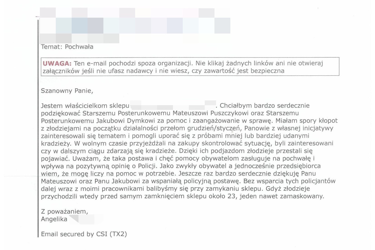 Przedsiębiorczyni z Rudy Śląskiej w swojej korespondencji odniosła się do zaangażowania policjantów w przeciwdziałanie dokonywaniu kradzieży w jednym ze sklepów na terenie miasta. Kobieta w sposób szczególny podziękowała st. post. Mateuszowi Puszczykowi oraz post. Jakubowi Dymkowi. Jak wskazała, policjanci w swoich działaniach byli w pełni zaangażowani i oddani sprawie.