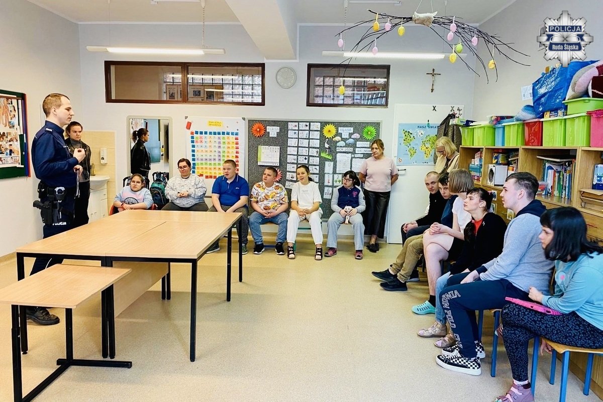 Rudzki profilaktyk z komendy spotkał się z uczniami Szkoły Podstawowej nr 12 Specjalnej, aby porozmawiać o bezpieczeństwie w różnych sytuacjach życia codziennego. Podczas prelekcji policjant zwrócił uwagę na zasady bezpiecznego poruszania się po mieście oraz na bezpieczeństwo w miejscu zamieszkania. Spotkanie miało prosty i praktyczny charakter, a dzieci aktywnie uczestniczyły w rozmowie i chętnie odpowiadały na pytania.