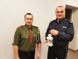 Zastępca komendanta Hufca Ruda Śląska im. hm. Łucji Zawada pwd. Michał Mazur HO zawitał dzisiaj do komendy policji, niosąc stróżom prawa betlejemskie światełko pokoju. Ten symboliczny bożonarodzeniowy ogień odebrał Zastępca komendanta mł. insp. Tadeusz Wolniak. Spotkanie było okazją do złożenia wspólnych świątecznych i noworocznych życzeń.