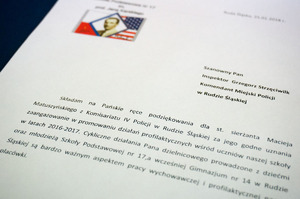 „Cykliczne działania dzielnicowego prowadzone z dziećmi i młodzieżą szkoły są bardzo ważnym aspektem pracy wychowawczej i profilaktycznej”. Między innymi takie słowa zawiera list Dyrektora Szkoły Podstawowej nr 17 z rudzkiego Wirku, który trafił na ręce Komendanta Miejskiego Policji w Rudzie Śląskiej. Pani dyrektor chciała w ten sposób wyrazić wdzięczność za zainteresowanie i pomoc okazaną jej placówce, przez dzielnicowego st.sierż. Macieja Matuszyńskiego.